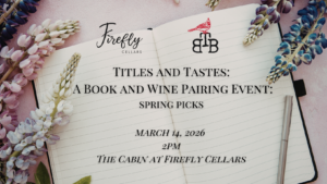 Each ticket includes: a book and wine pairing (six total wines), snacks, and a $10 credit toward your first book purchase! Attendees will also receive 15% off any additional wine purchases in the tasting room the day of the event.